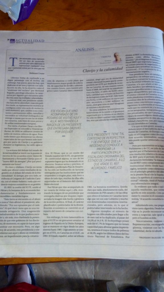 Al tiempo, durante años hemos visto despedirse de la España de las soluciones, una por una, a todas la colonias, mientras los canarios hemos quedado atrapados en la caja de música del himno sin letra, de España. Y una y otra vez a mirar hacia arriba, hasta los que seguro, ciertamente aspiran a ser libre, buscando el manual de instrucciones para la libertad en una y otra mitomanía, en alguna catedral de las europas o de las américas que nos elevará a los cielos.